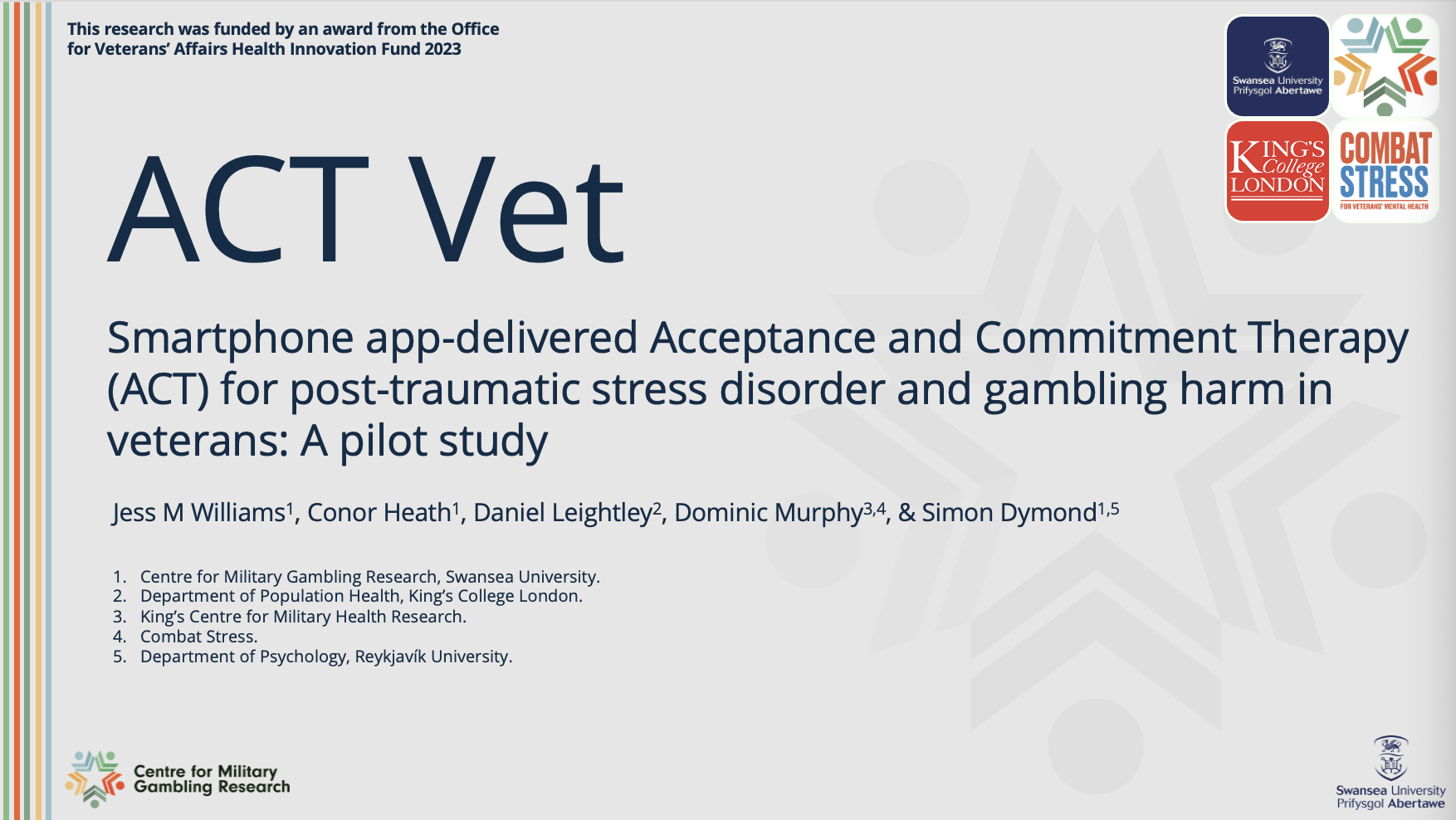 Jess shared the findings of ACT Vet, our smartphone application designed to support UK veterans experiencing symptoms of PTSD and gambling harm. It was an honour to share the stage with leading voices in military mental health and to engage in discussions around innovative digital solutions. As NICE guidelines call for Armed Forces-specific treatments, our work contributes to a growing evidence base for accessible interventions, tailored to veterans' needs.